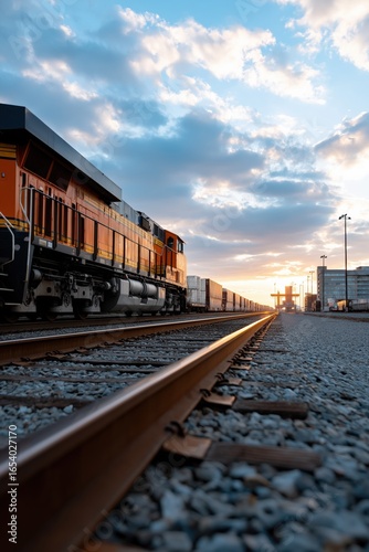 © Iryna, Fototapeta premium Freight train on railroad tracks at sunset with dramatic sky