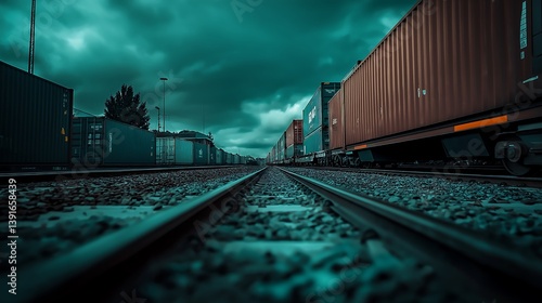 © Indika Rz, Obraz premium Freight Train on Tracks Under a Dramatic Teal Sky