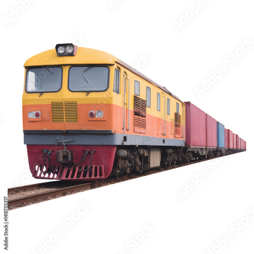© JK_kyoto, Obraz premium Freight Train on Tracks with Colorful Containers in Bright Daylight, isolated on transparent background.