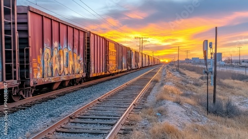 © Hammam, Obraz premium Freight Train Passing Through Rural Landscape at Sunset