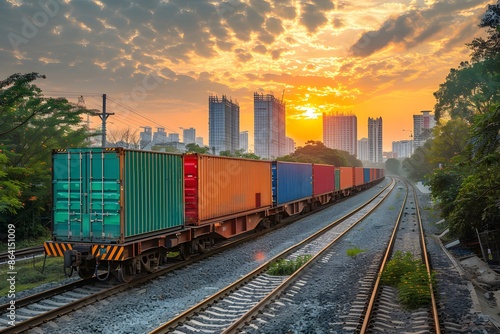 © Valentin, Fototapeta premium Freight Train Passing Through Urban Landscape at Sunset