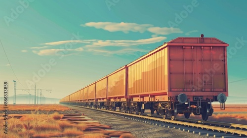 © Various Backgrounds, Obraz premium Freight train. Rear view of the last wagon of a freight train. Wagons with goods delivery. Distribution and freight transportation using railroads.