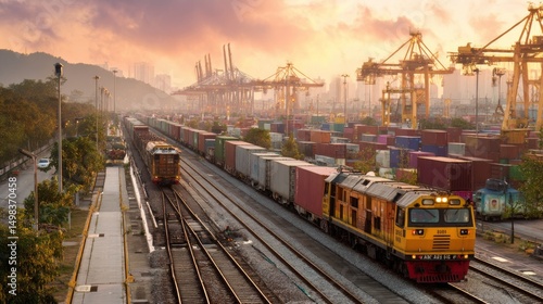 © songpol152, Fototapeta premium Freight train transportation port city industrial scene dusk light aerial view urban development