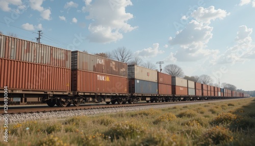 © Chatchawan, Obraz premium Freight train transporting cargo railroad tracks photography open landscape side view industrial logistics