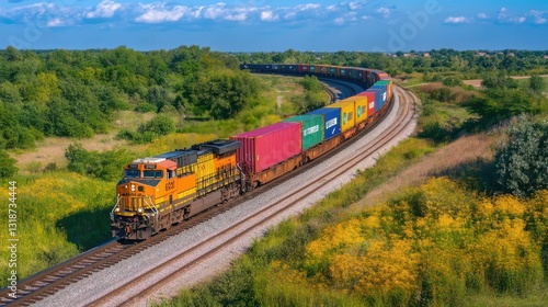 © sergiokat, Obraz premium Freight Train Transporting Shipping Containers Through a Lush Green Landscape on a Sunny Day