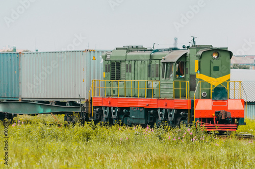 © aapsky, Obraz premium Freight train wagons with containers sorting station.