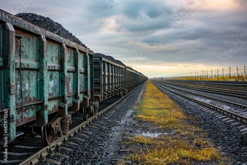 © andriya, Fototapeta premium Freight Train With Coal Carriages On Railway Tracks