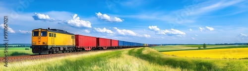 © Naput, Fototapeta premium Freight train with industrial cargo, rural landscape, Watercolor style