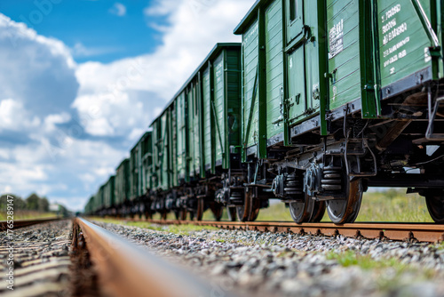 © Emanuel, Obraz premium Freight train with long line of cargo wagons in countryside