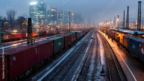 © Khai, Obraz premium Freight Train Yard with Cityscape at Night