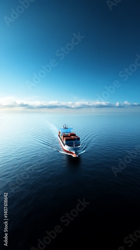 Obraz premium Freight transport by sea, cargo ship with containers on smooth water and morning light