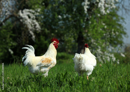 Fototapeta premium Freilaufende Hühner Hahn beim fressen im Gras