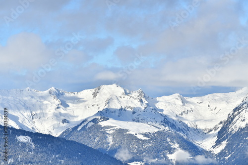Obraz premium French alps on a sunny day under the clouds by winter covered with snow