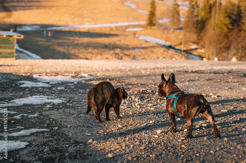 © adrianad, Naklejka premium French bulldog and cat on the road at sunset