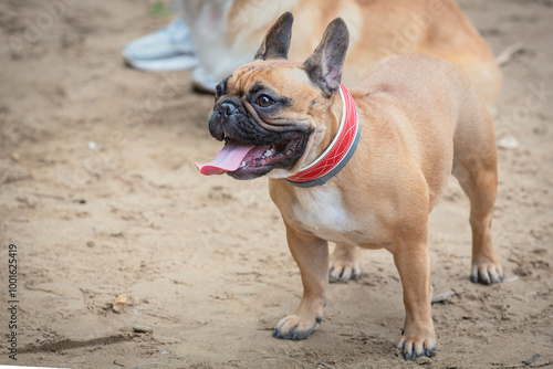 Fototapeta premium French bulldog dog standing in a field on a bright summer day