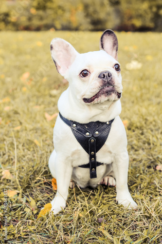 Fototapeta premium French Bulldog in spring park on a background of green grass