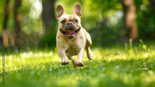 © Ace64 Studio, Fototapeta premium french bulldog playing in the park: Happy french bulldog running and playing in a green park.