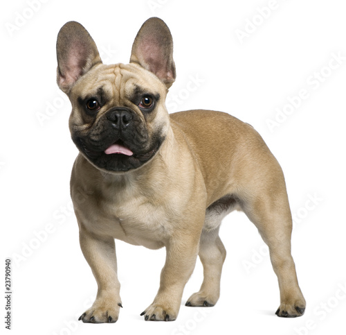 © Eric Isselée, Fototapeta premium French Bulldog puppy, 7 months old, standing in front of white b