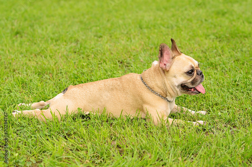 Fototapeta premium French Bulldog resting on green grass