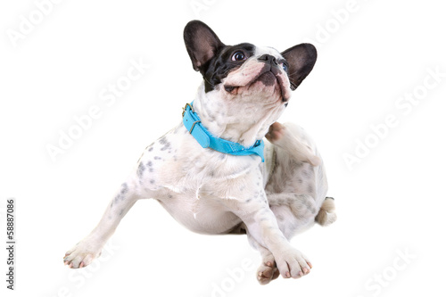 Fototapeta premium French bulldog scratching his ears over white background