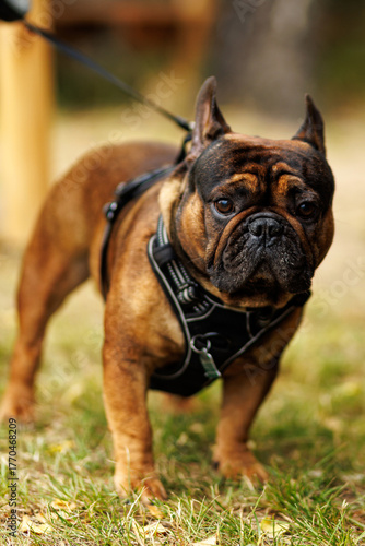 Fototapeta premium French bulldog standing on grass wearing black harness