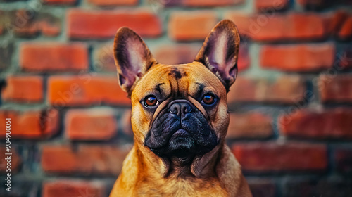 © Nikname, Obraz premium French Bulldog with a flat face in front of a brick wall.