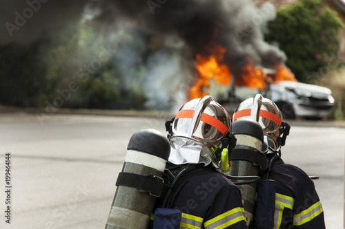 © Christielakierephoto, Obraz premium french firefighter binomial attac on car fire