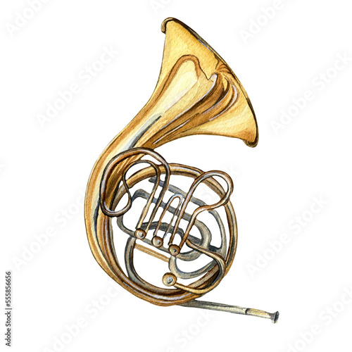 Fototapeta premium French horn brass musical instrument watercolor illustration on white...