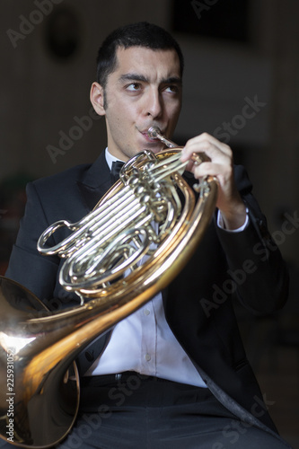 Obraz premium French horn player. Hornist playing brass orchestra music instrument.