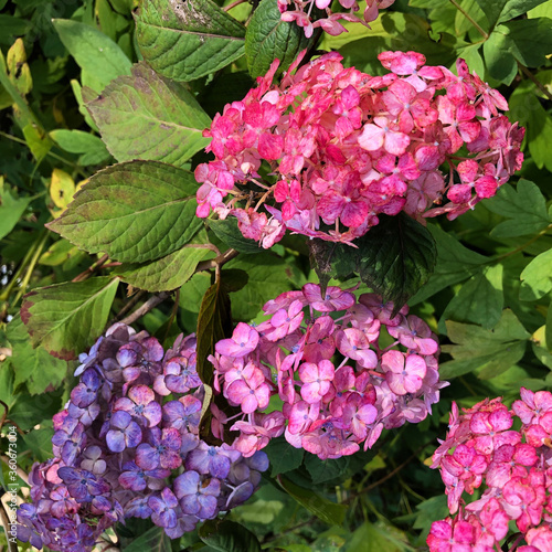 © Diane, Obraz premium French hydrangea (hydrangea macrophylla) bush with pink, magenta, purple blossoms