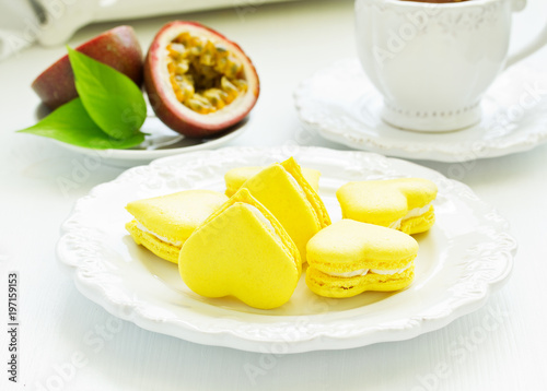 Fototapeta premium French pastry makaron. Heart shape. Valentine's Day. Selective focus