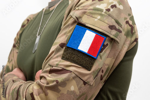 Obraz premium French soldier in uniform with camouflage and identification badges on white background.