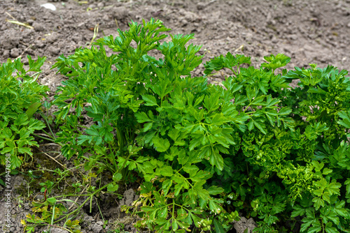 Obraz premium Fresh and green parsley grows in a bright beautiful garden bed.