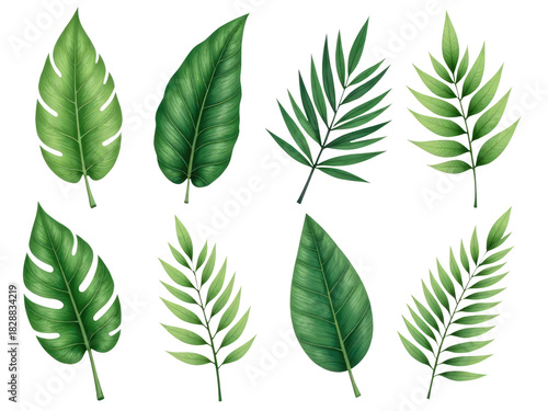 Obraz premium Fresh and green tropical leaves on a plain white background, perfect for...