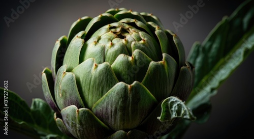 © Artyom, Fototapeta premium Fresh artichoke close-up with dark background and green leaves