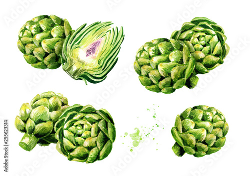 Obraz premium Fresh artichoke set. Watercolor hand drawn illustration, isolated on white...