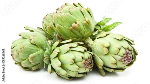 Fototapeta premium Fresh artichokes arranged on a white background showcasing their vibrant...