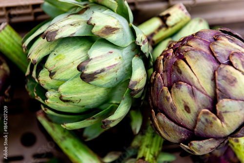 Fototapeta premium fresh artichokes at farmers market, close-up