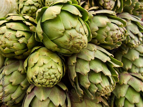 Obraz premium Fresh artichokes at green grocery on Mediterranean street market, southern Europe