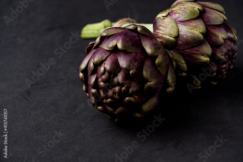Fototapeta premium fresh artichokes close-up on dark gray background