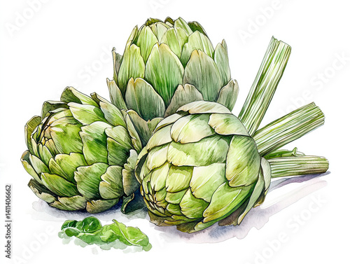 Obraz premium Fresh Artichokes in Detailed Watercolor Illustration Style