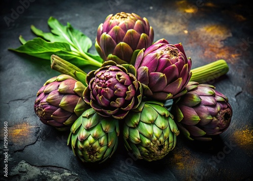 © chaowalit, Fototapeta premium Fresh Artichokes on Rustic Metal, Spring Vegetables, Gourmet Food Photography