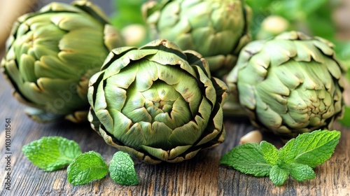 © รุ่งอรุณ ศรีนรสิทธิ์, Fototapeta premium Fresh Artichokes on Wooden Background
