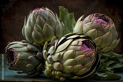 © FotoIdee, Fototapeta premium Fresh Artichokes On Wooden Table And Dark Background - Generative AI