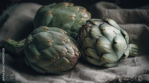 © Terablete, Obraz premium Fresh artichokes resting on a gray cloth in a home kitchen setting during the afternoon