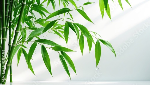 Fototapeta premium Fresh bamboo leaves frame with water droplets set against a white background, botanical zen forest, tropical spa decor, backdrop offering copy space.