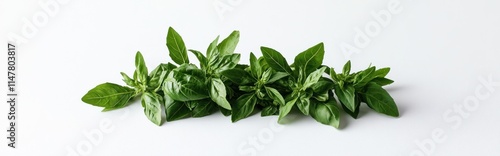 © BerkahStock, Obraz premium Fresh basil leaves in a row, isolated on a white surface.