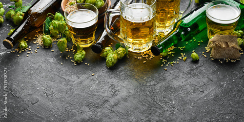 Naklejka premium Fresh beer in glasses and fresh green hops on a black stone background. Banner.
