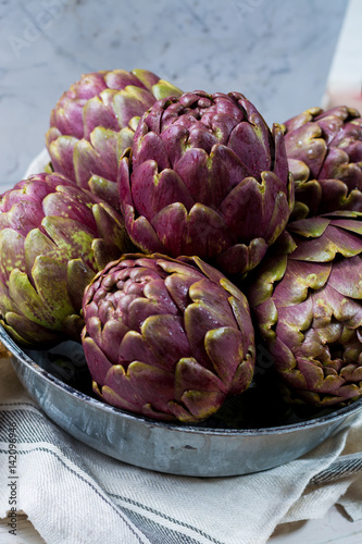 © barmalini, Fototapeta premium Fresh big Romanesco artichokes green-purple flower heads ready to cook