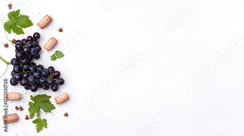 Fototapeta premium Fresh Black Grapes with Corks and Leaves on White Background